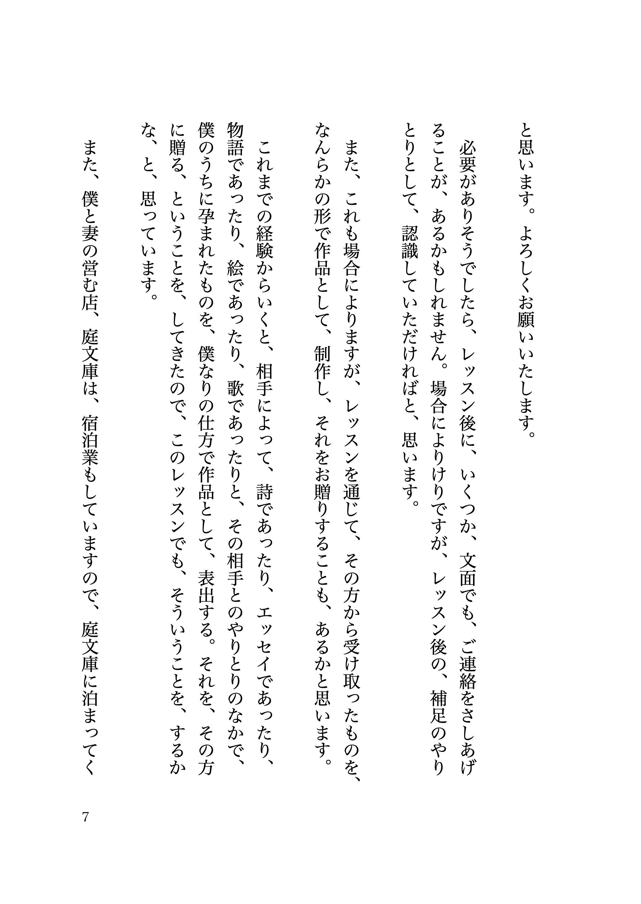 これまでの経験からいくと、相手によって、詩であったり、エッセイであったり、物語であったり、絵であったり、歌であったりと、その相手とのやりとりのなかで、僕のうちに孕まれたものを、僕なりの仕方で作品として、表出する。それを、その方に贈る、ということを、してきたので、このレッスンでも、そういうことを、するかな、と、思っています。