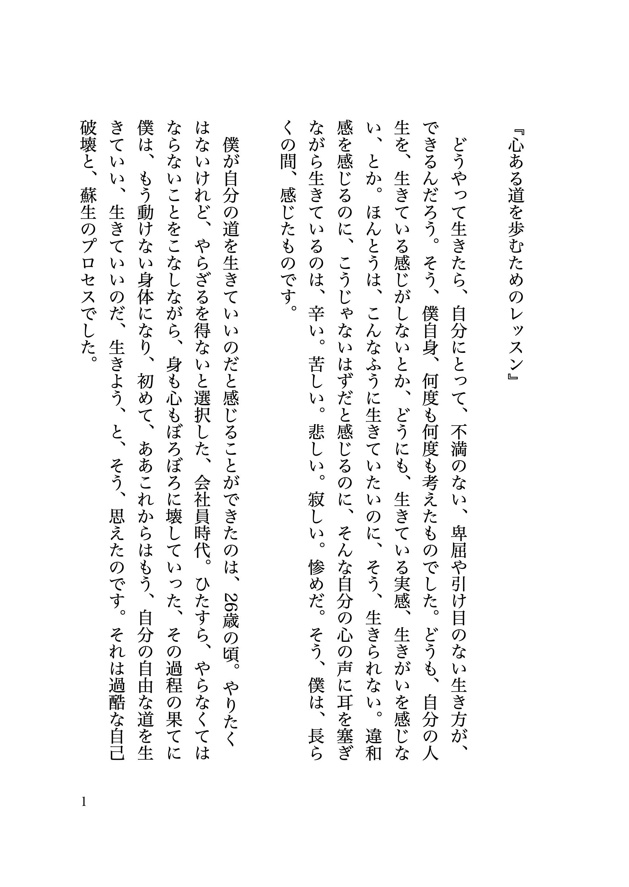 僕が自分の道を生きていいのだと感じることができたのは、26歳の頃。やりたくはないけれど、やらざるを得ないと選択した、会社員時代。ひたすら、やらなくてはならないことをこなしながら、身も心もぼろぼろに壊していった、その過程の果てに僕は、もう動けない身体になり、初めて、ああこれからはもう、自分の自由な道を生きていい、生きていいのだ、生きよう、と、そう、思えたのです。それは過酷な自己破壊と、蘇生のプロセスでした。